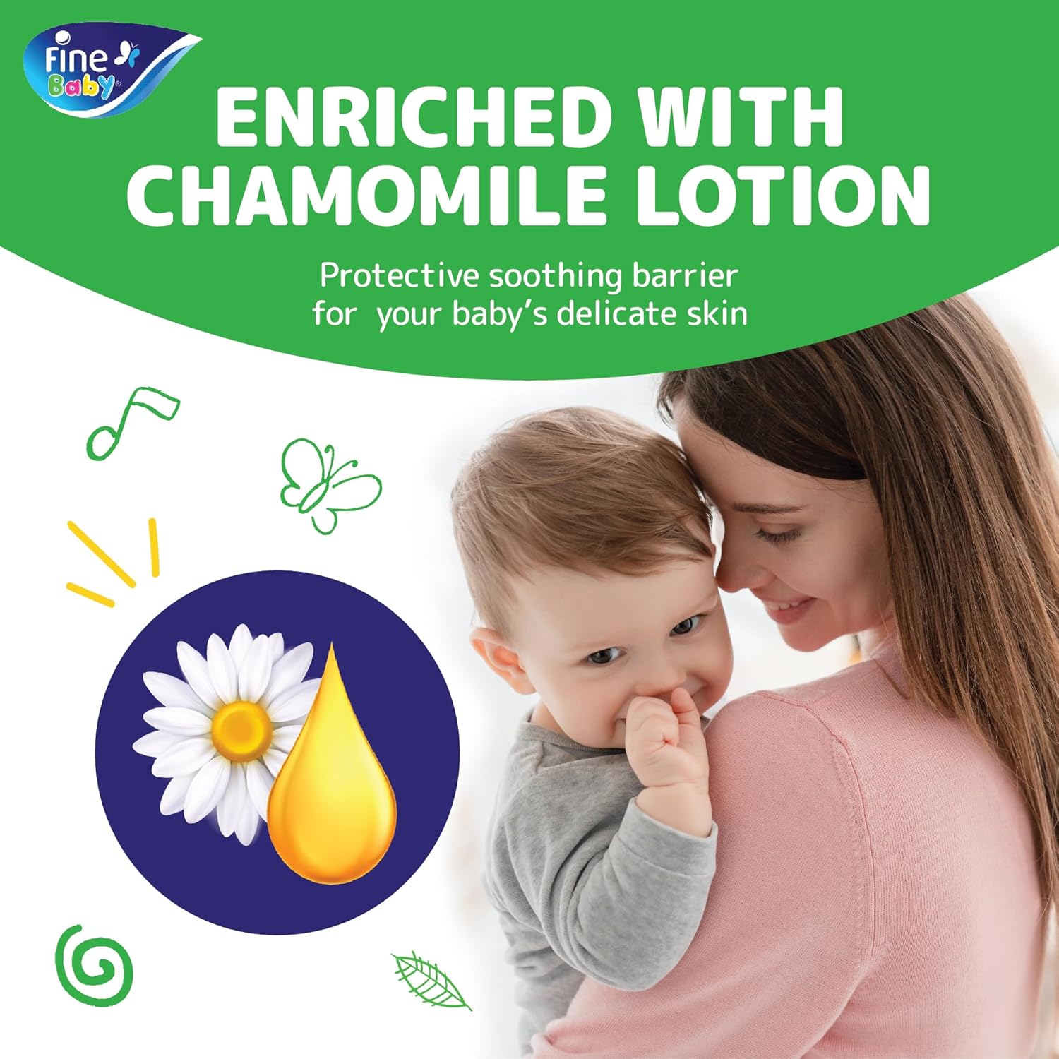 - حفاضات فاين بيبي ناعمة وملطفة ومدعمة بالبابونج للمساعدة في ترطيب بشرة طفلك وحمايته من طفح الحفاضات